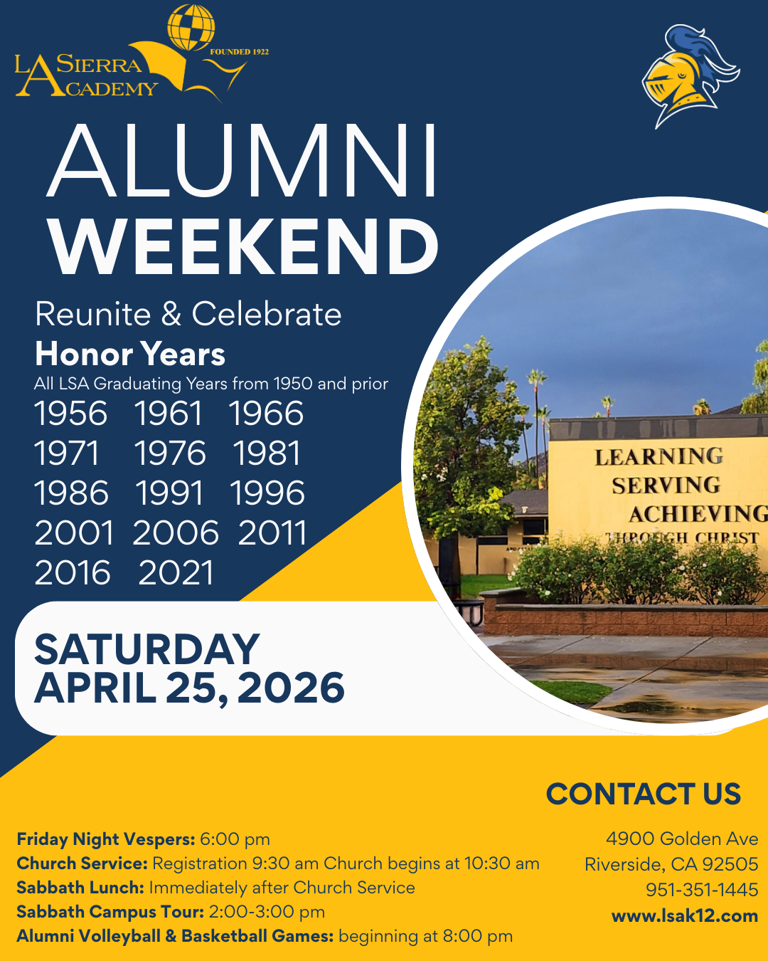 Founded in 1922, La Sierra Academy has nearly 8000 alumni and countless friends and supporters. This web page is dedicated to you. Please make it a habit to visit often as we continue to improve its contents with programs, school news, events, and opportunities for alumni involvement. And invite a friend to join the LSA alumni community.♦
